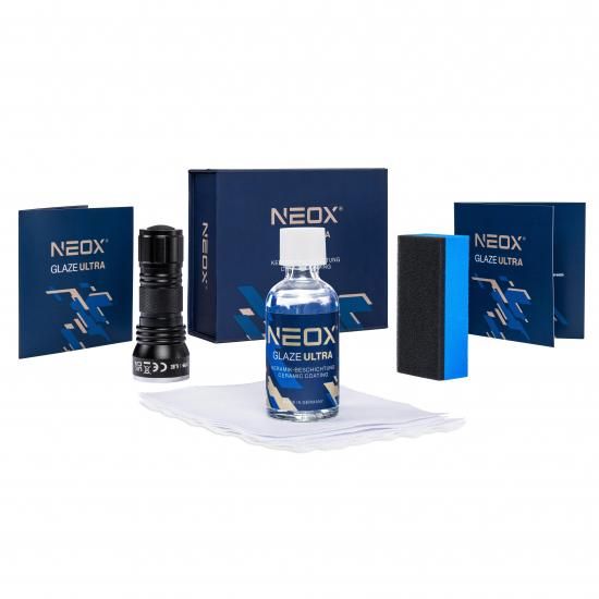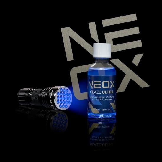 NEOX®Glaze Ultra systemは、愛車を新車以上の輝きと保護力で包み込むオールインワンのコーティングシステムです。ポリトップ独自の特殊ポリシラザンが強固に結合し、驚くほど汚れを寄せ付けない硬い保護層を長期にわたり発揮します。付属の専用ツールと革新的なUV技術によりブラックライトを当てるだけで拭き残しを確認できるためムラのない完璧なコーティングができます。